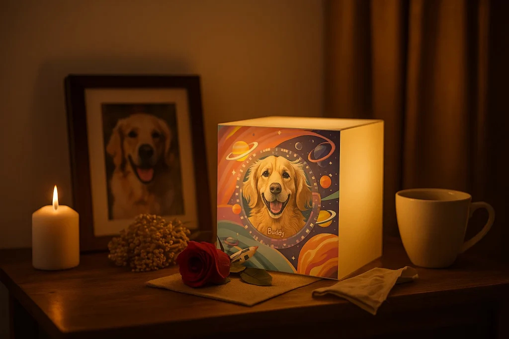 When pets pass, their absence is profound. A memorial version of the LED lamp cube—featuring the pet portrait with soft, pastel tones or a rainbow motif—serves as a gentle tribute. Use RainbowBridge in the design or caption to symbolize they’re at peace. Display it in a special corner of your home to honor cherished memories.