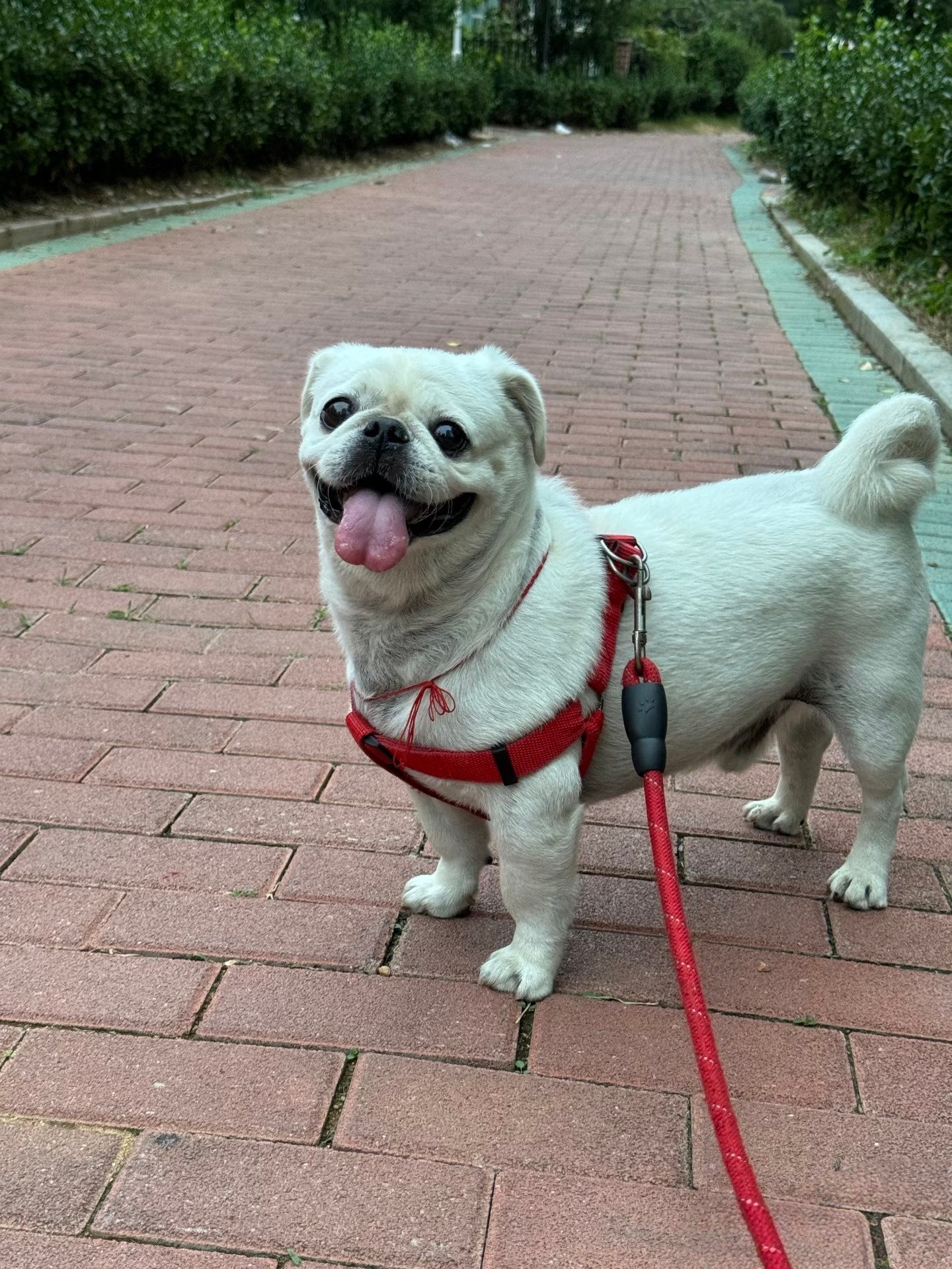 crossing the rainbow bridge with a curious tilt of the head,