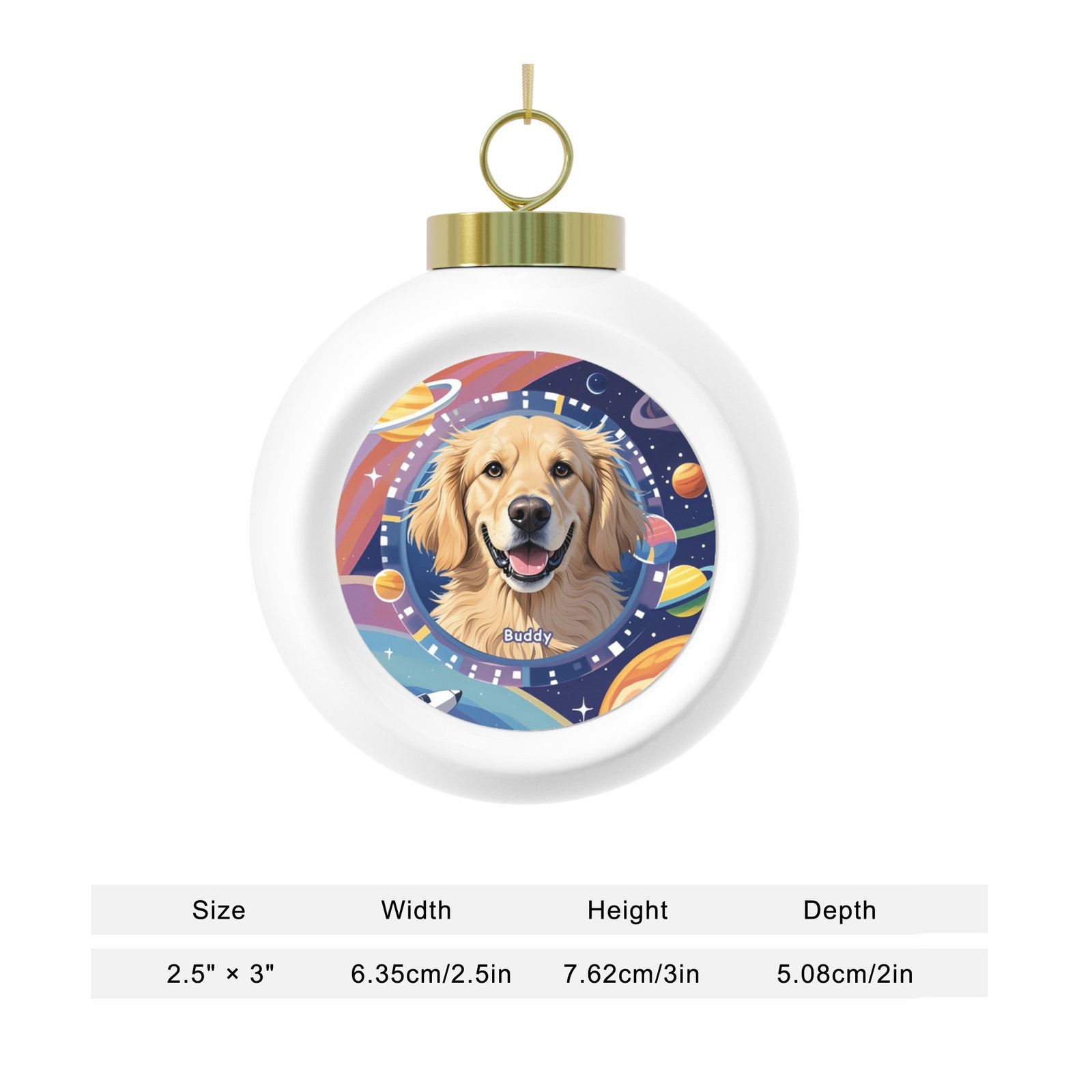 - Includes: Gold ribbon for hanging